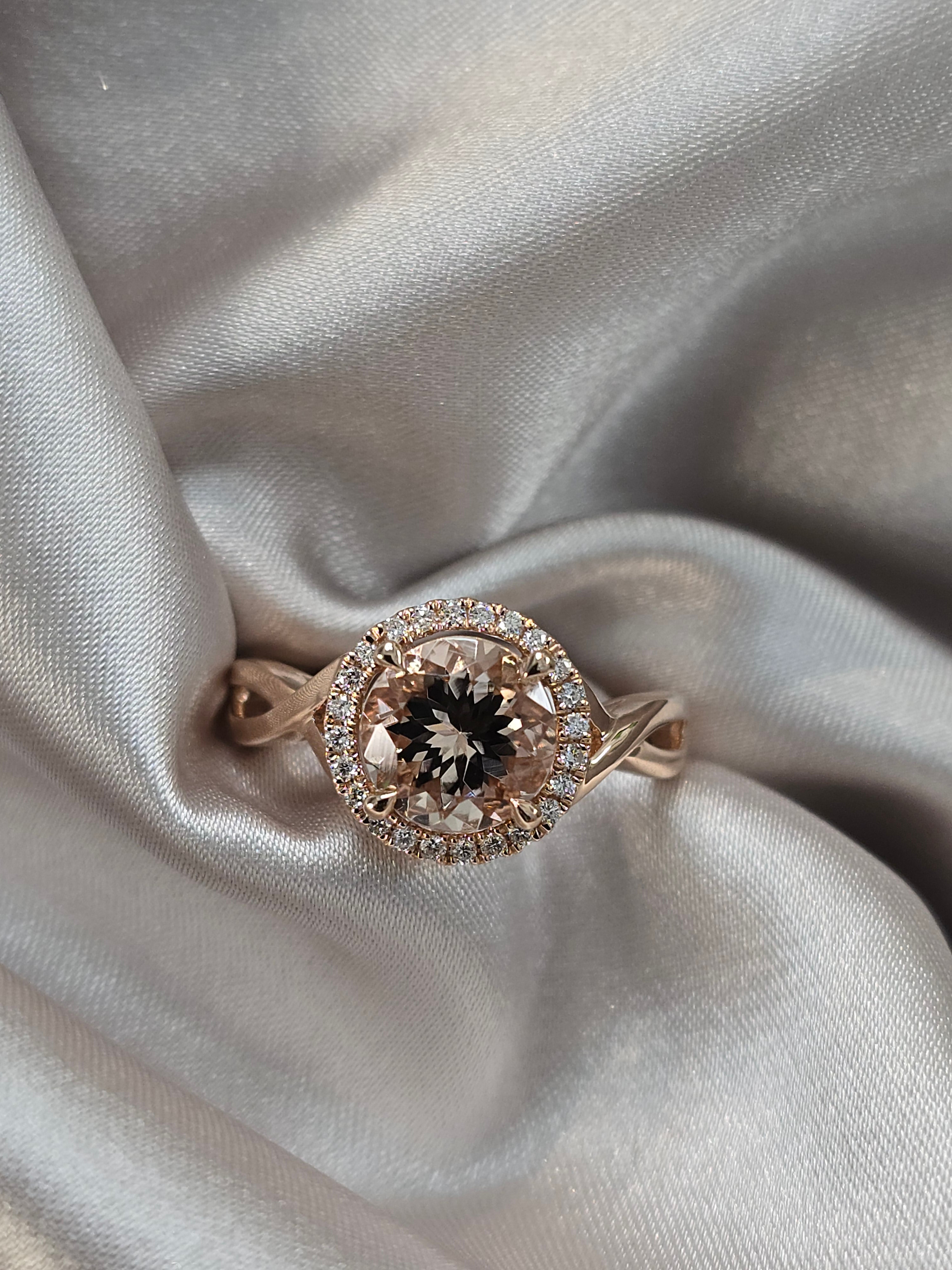 Regular price $2,500.00Sale price $2,500.00 Regular price $2,850.00Unit price / per14kt rose gold 1.81ct Apricot Morganite 0.13ct natural FGSI diamonds (24 diamonds) size P