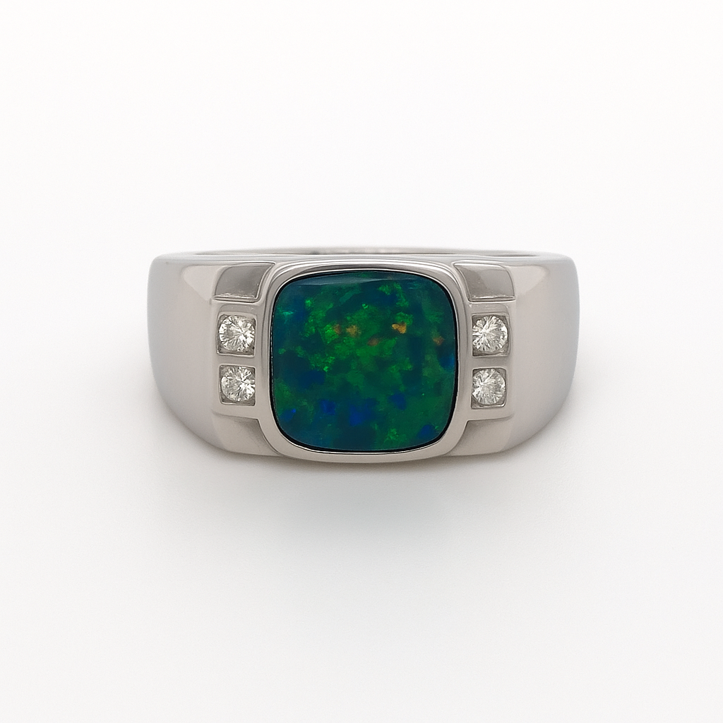 Regular price $1,250.00Sale price $1,250.00 Regular priceUnit price / perCentre Stone Type: Solid Crystal Opal Finger Size: L Metal: 14kt White Gold Band Width (mm): 1.7 Weight (g): 3.4