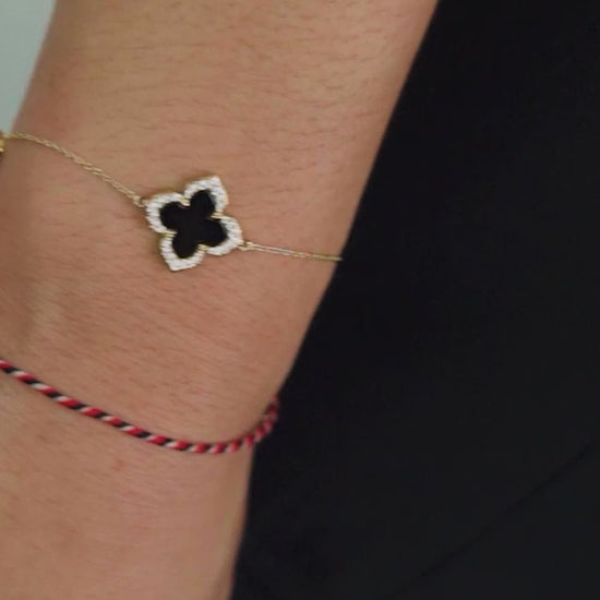 Crafted from 18k gold e-coated 925 sterling silver, the bracelet features a captivating black agate four-leaf clover, symbolising luck and elegance. The pointed silhouette is beautifully framed by a shimmering stone-set edging, adding a touch of brilliance to its bold design.