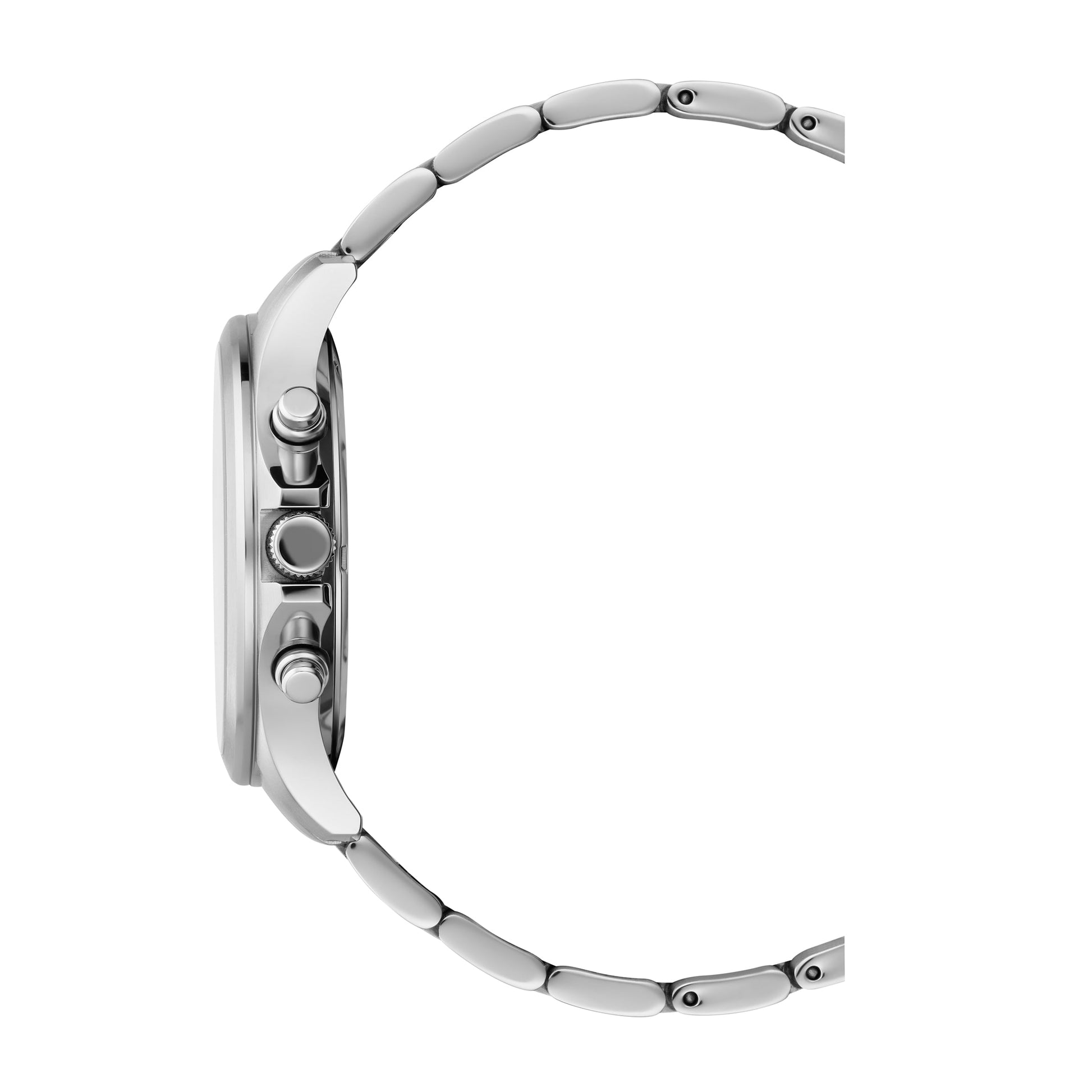 A scratch- and shock-proof sapphire crystal watch glass protects the clearly arranged the functional dial of the chronograph stopwatch. Partial luminous hands, baton indexes, 3 subsidiary counters and date display at 4 o’clock complete the dynamic sportive design of the precision timepiece with water resistance to 100 m.